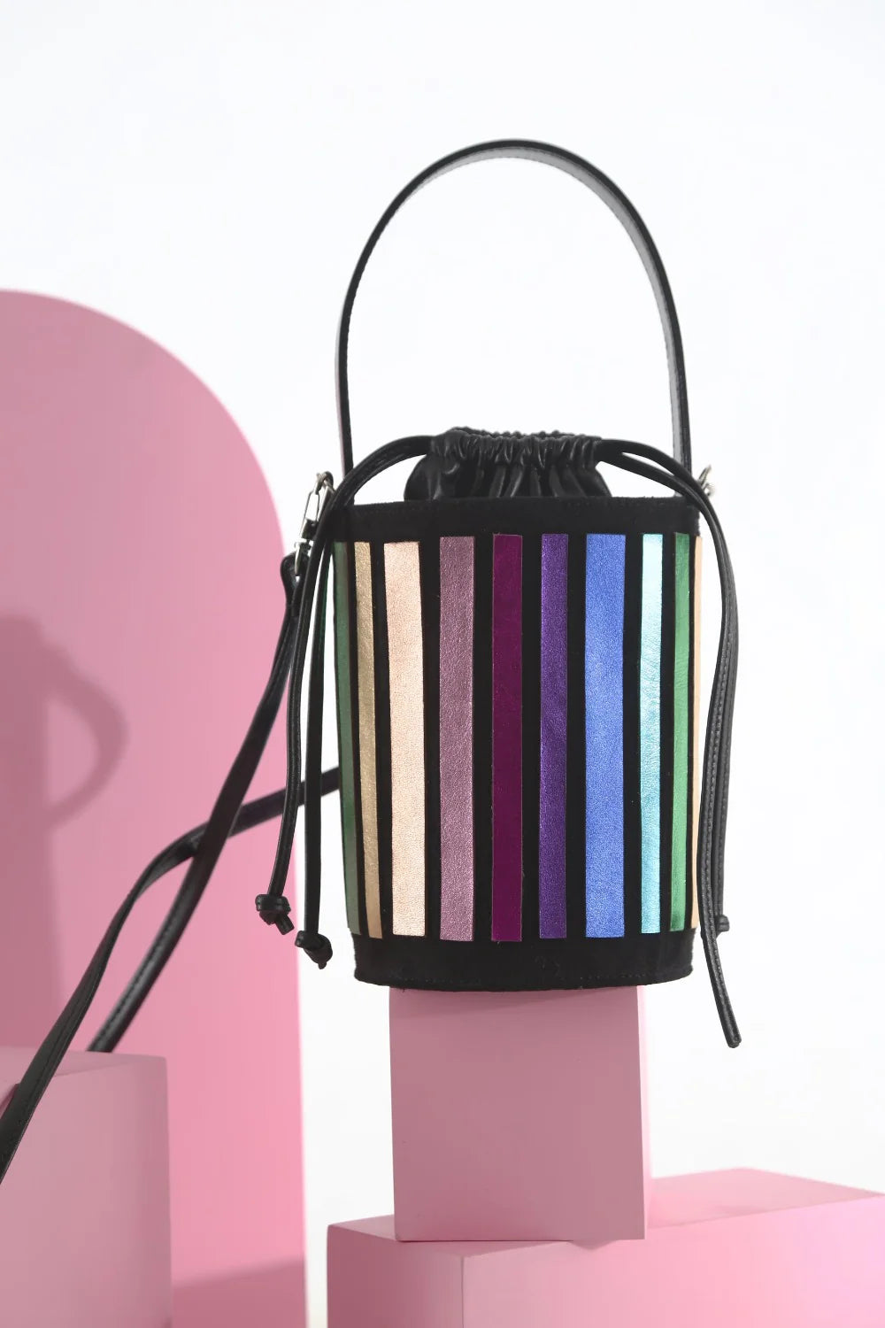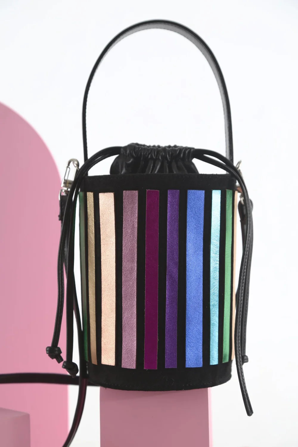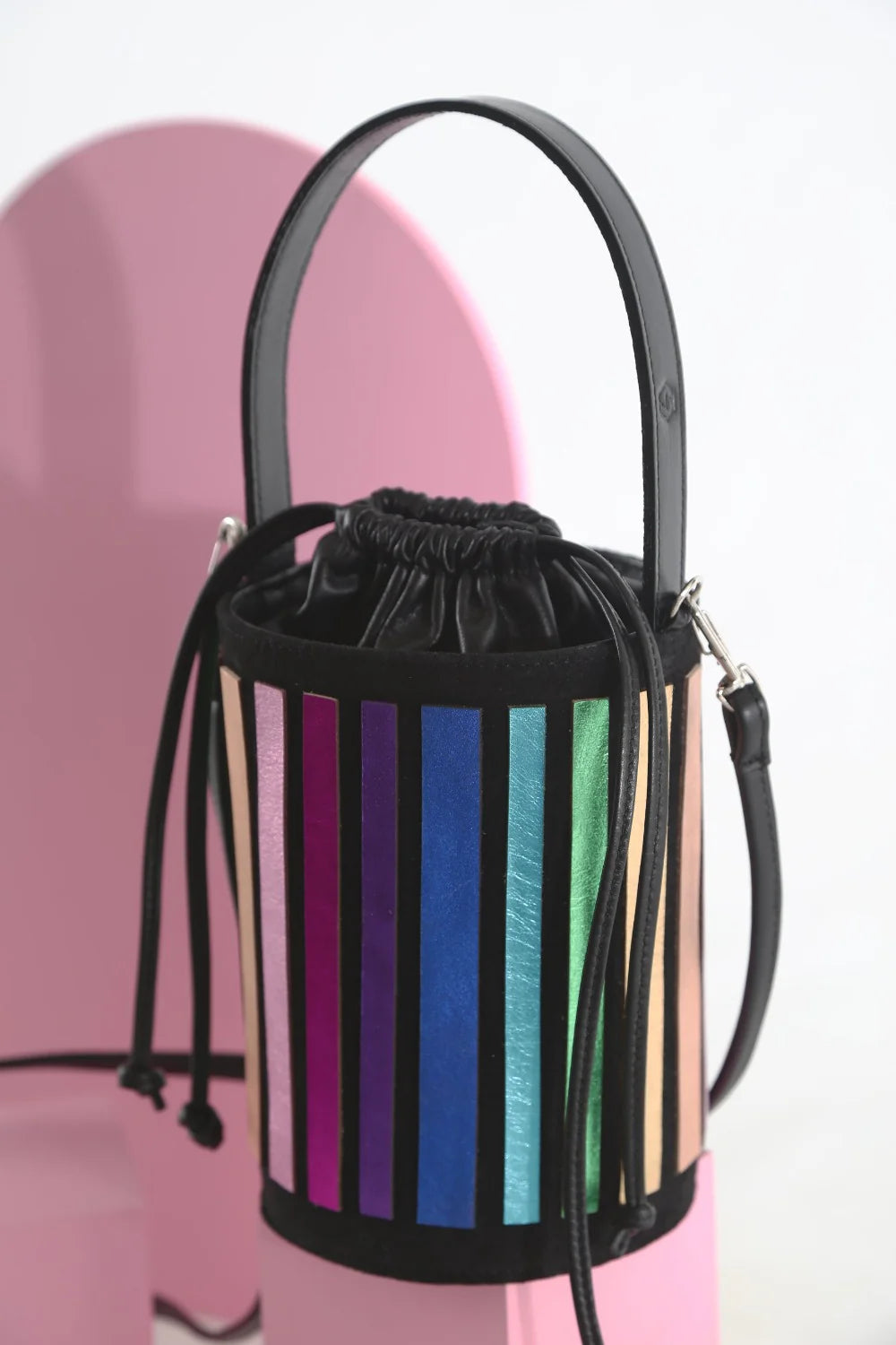 The Rainbow Bucket Bag is handmade in Buenos Aires. It is a craftsmanship process and it's made of 100% cow leather with care and attention to detail. Its bottom is rigid and made of black glossy leather. It has a short handle that enables hand and elbow carry and a long removable strap to wear it as a shoulder or cross-body bag. The bag closes with a drawstring and there are 2 inside pockets.