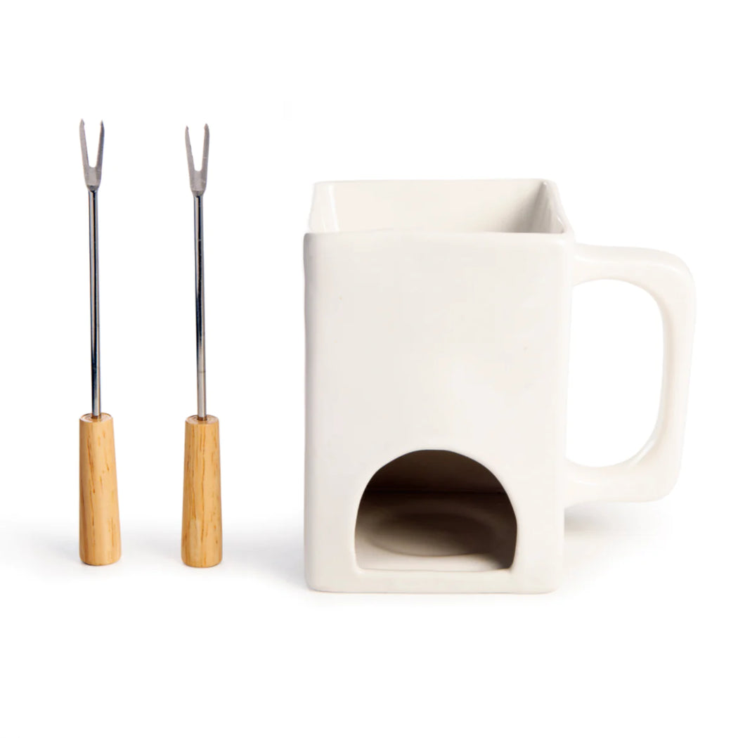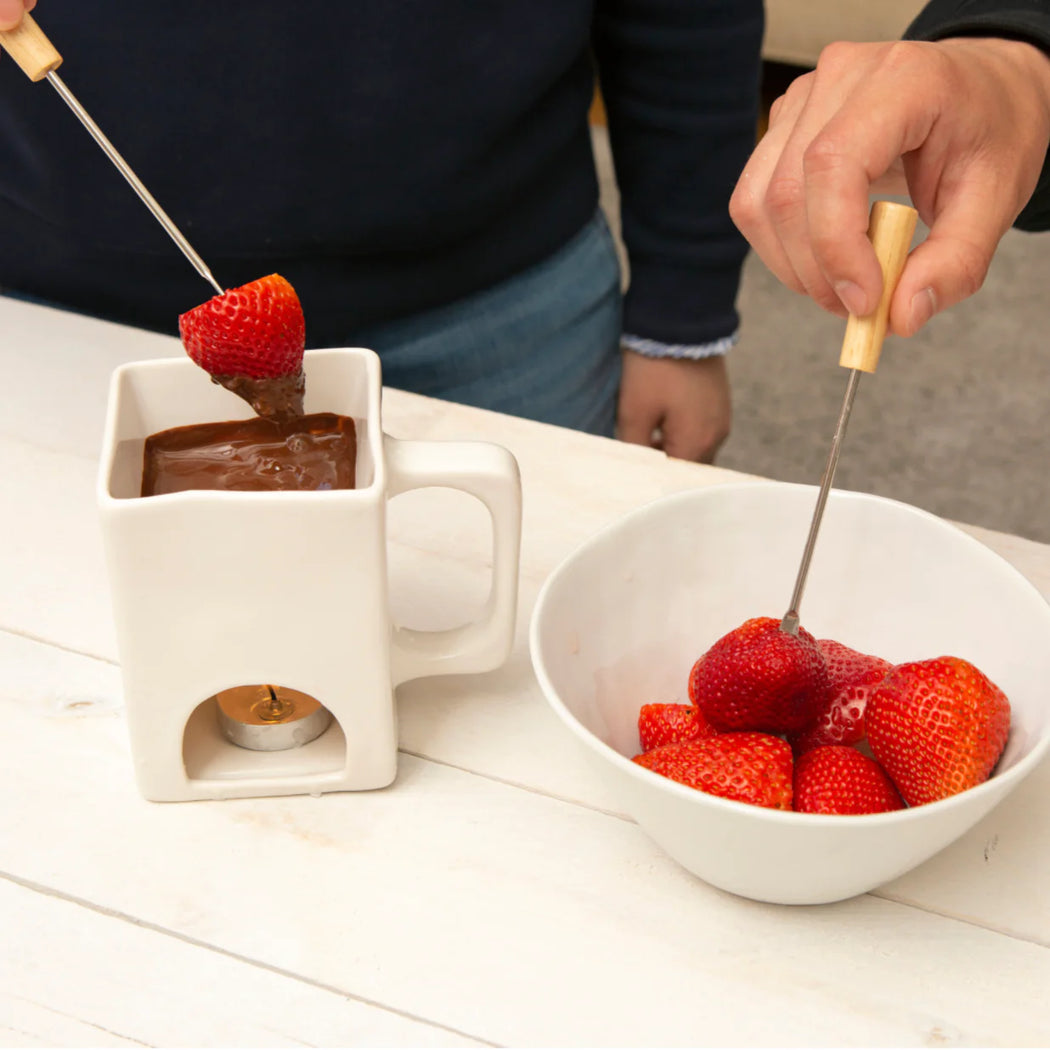 "Fondue for Two" is a charming mini fondue set perfect for intimate gatherings or solo indulgences. It only requires a tea light candle to melt your choice of chocolate, cheese, or butter.