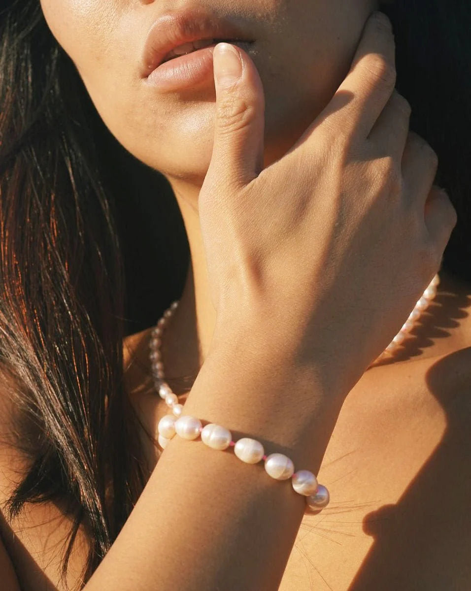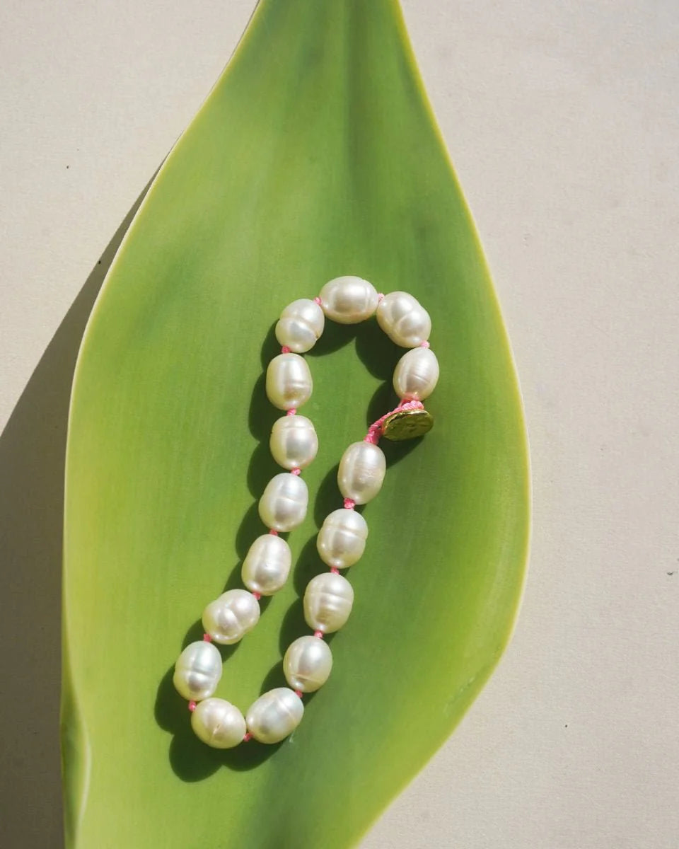 Juicy large fresh water pearls to wrap around your wrist... Neon pink and yellow knots scattered through out the bracelet brings a touch of modern to a classic design. Hand carved brass button closure.