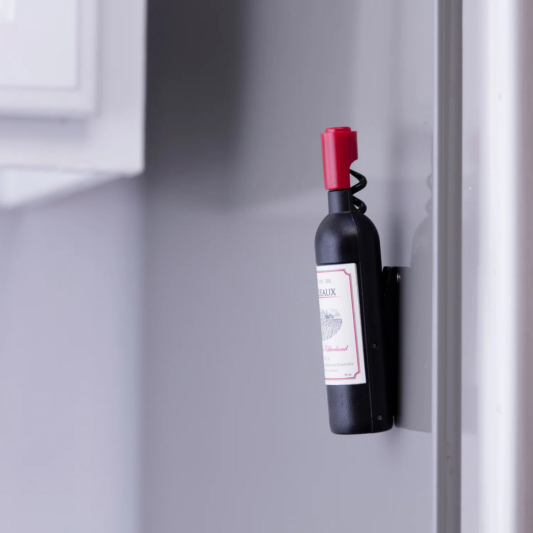 This handy mini wine bottle helps you open the full-sized ones. Bottle opener flips out to reveal a corkscrew. Magnetic construction makes it easy to store in just about any kitchen.