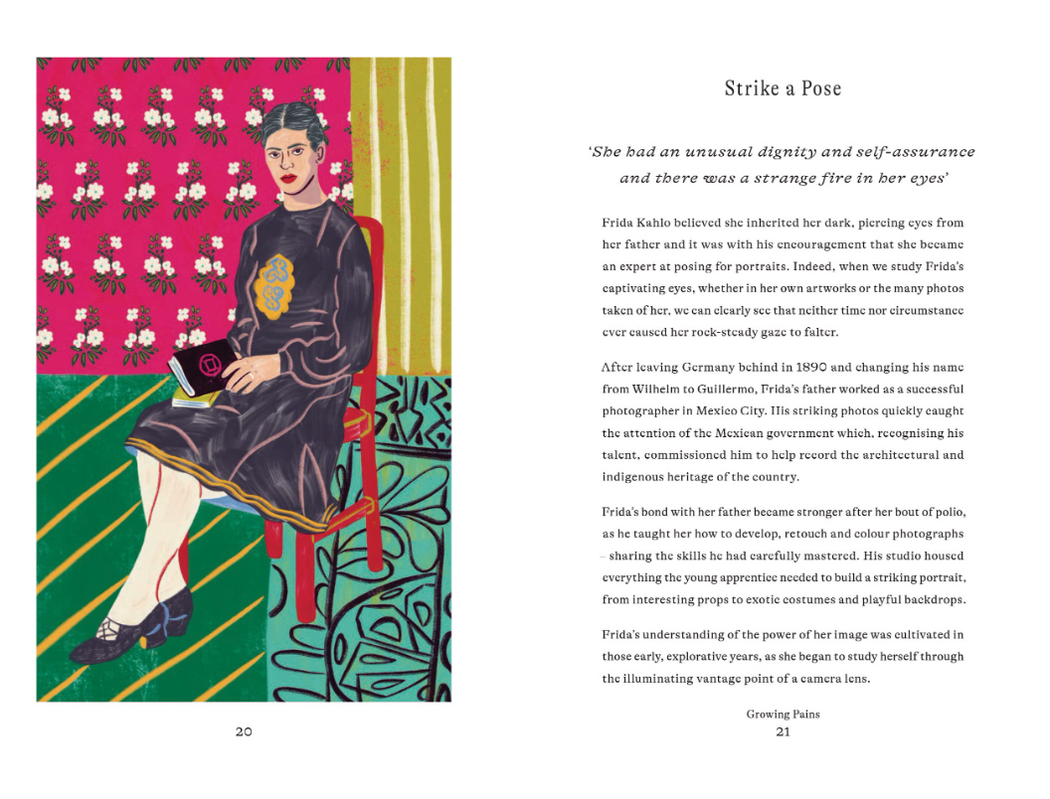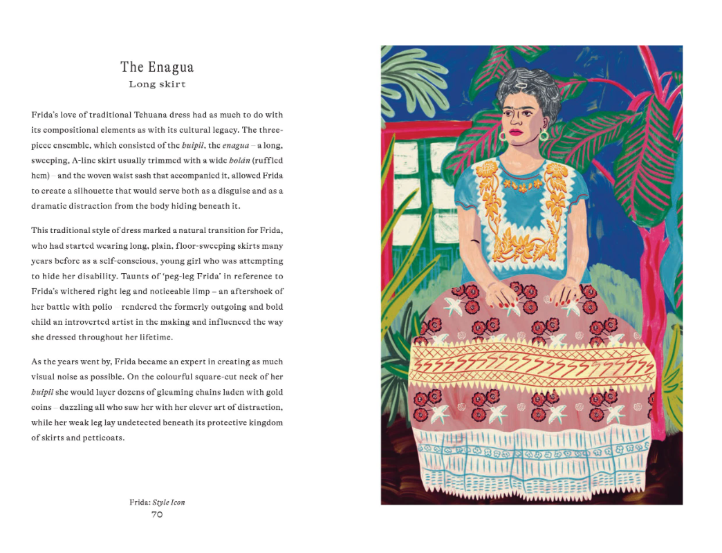 Frida: Style Icon charts Frida's fashion evolution through 50 beautifully illustrated style moments including pieces from her famous wardrobe, her most iconic looks and her own special kind of styling.