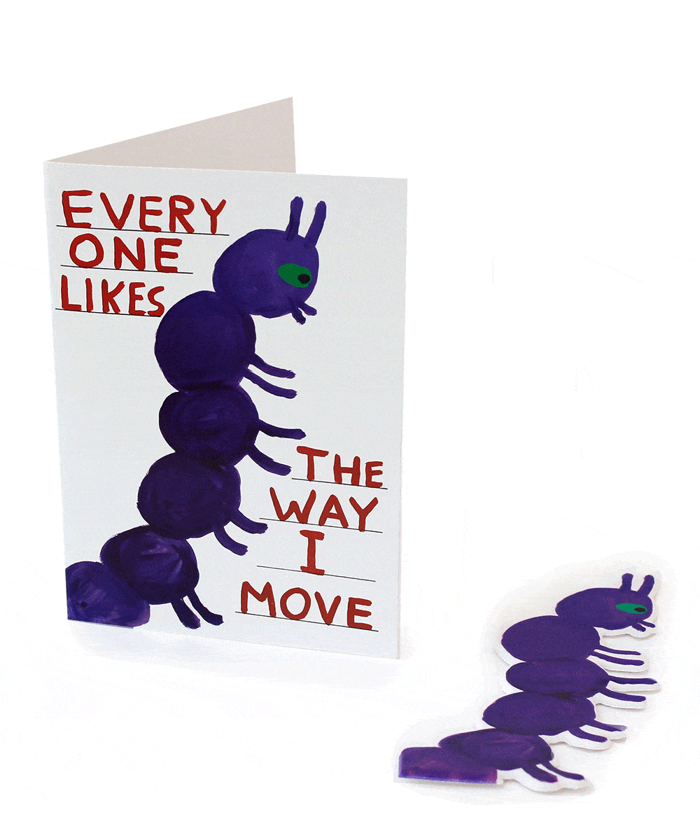 The "Everyone Likes The Way I Move" Greeting Card features the unique artwork of David Shrigley, a British artist known for his distinctive drawings and sculptures. This card includes a special eco-friendly foam sticker, showcasing Shrigley's style, which often involves humorous and absurd elements.