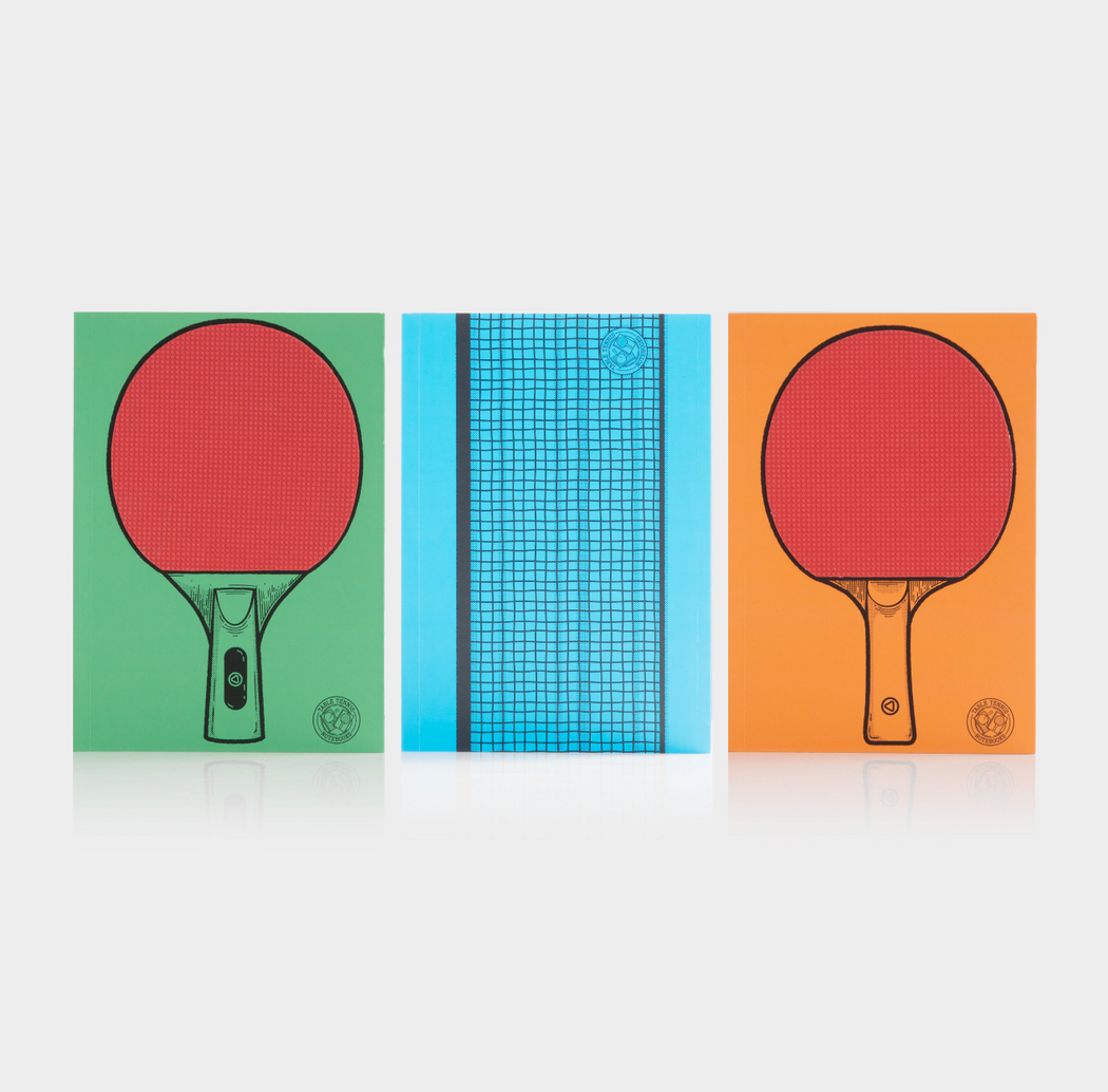 2 paddles and a net printed onto notebook covers: