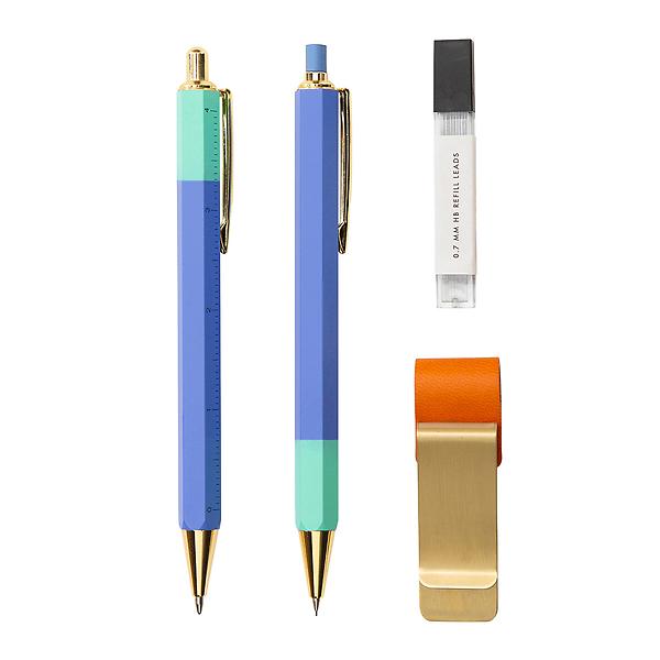 Precise note-taking is easier with a writing set that includes both a mechanical pencil and pen, plus lead refills and convenient pen holder clip. Highlighted by brass accents, these desk accessories elevate the look of any workspace.