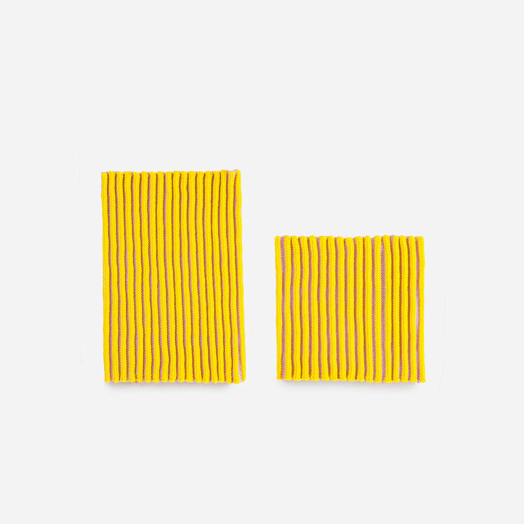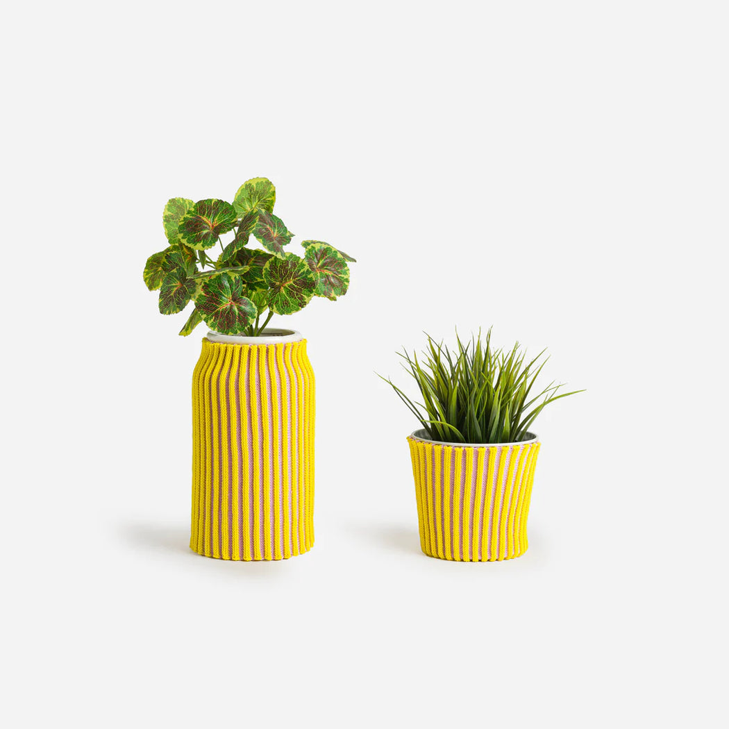 We made this set of ribbed sleeves with houseplants in mind, but who knows what you'll think of? Dress up any vessel with modern, stretchy stripes. Set includes 1 medium and 1 small sleeve. Multi-colored striped sleeves are made entirely from deadstock material.