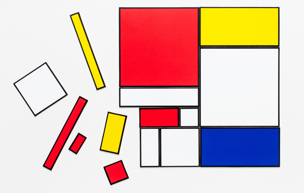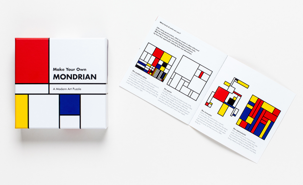 A modern art puzzle. Engage in a world of abstract equilibrium with 57 tiles inspired by the modernist master Piet Mondrian. Arrange the tiles to create table-top compositions of perfect balance, large or small.