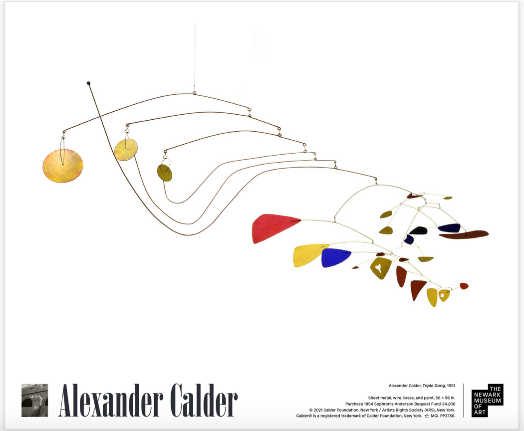 This limited-edition poster of Triple Gong, 1951, includes a photograph of Calder installing the work at the museum at the lower left corner.