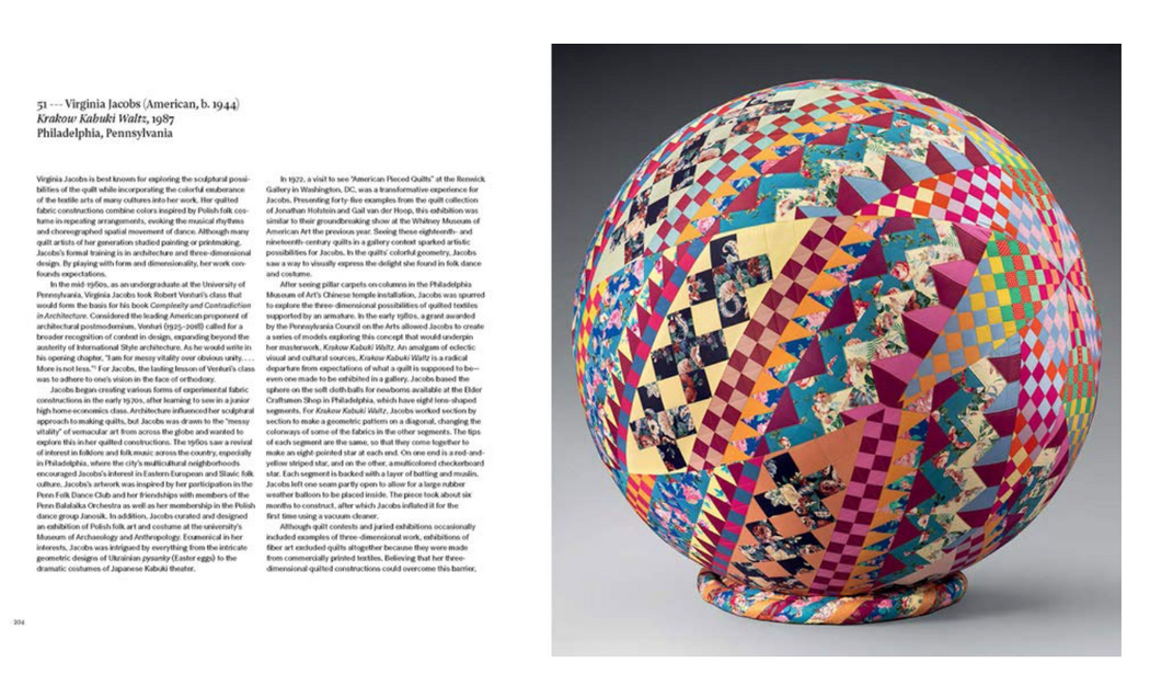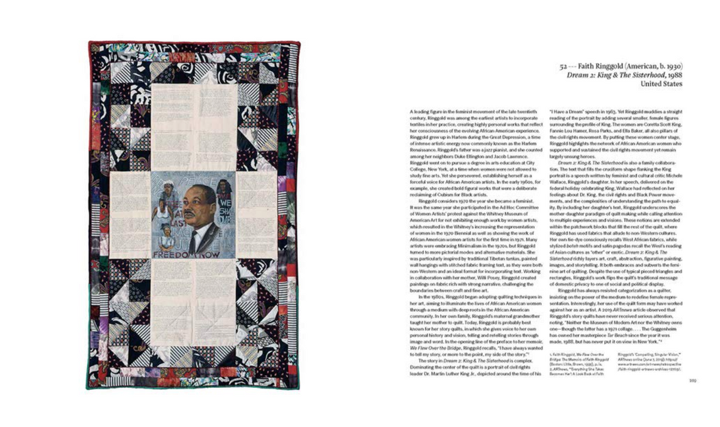Artists include: Bisa Butler, Faith Ringgold, Sanford Biggers, Irene Williams, Harry Tyler, Harriet Powers, Marie D. Webster, Marguerite Zorach, Dorothy Phillips Haagensen, Rachel Cary George, Florence Peto, Creola Pettway, Susan Hoffman, Molly Upton, Nancy Crasco, Agusta Agustsson, Edward Larson, Michael James, Virginia Jacobs and Carla Hemlock.