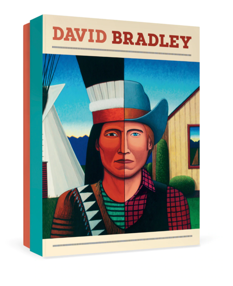 In each of David Bradley’s portraits, meticulous detail and nuanced composition drive an intelligent sociopolitical message. Bradley is an enrolled member of the Minnesota Chippewa tribe and, for decades, he has deftly juxtaposed rather heavy concepts with a lighthearted touch, taking on the Southwest art world, critiquing the commodification of Indian culture, and commenting on the political realities of mixing the traditional and modern.