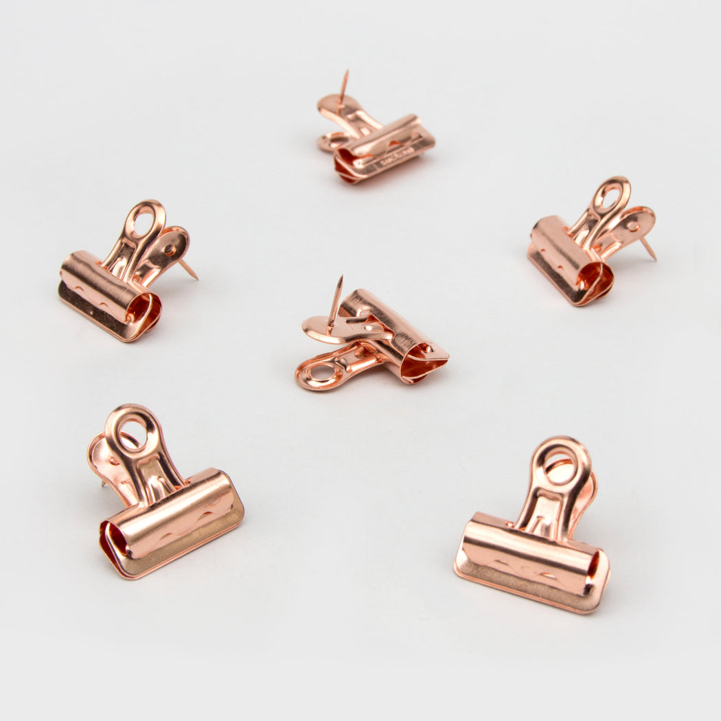 Safely pin your precious photos with these stylish mini bulldog clips. Now you can pin up your polaroids, special postcards and upcoming gig tickets without leaving pin-holes. Clip your notes in place and display on any pinboard. These mini rose gold bulldog clips will ensure on-trend organization and transform any boring cork-board. With 12 in a pack, these neat little pins are the safe and stylish way to display treasured mementos and mini works of art.