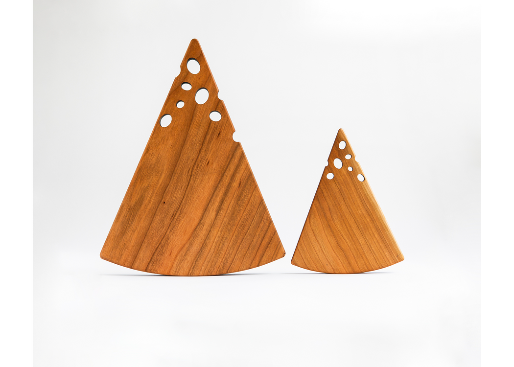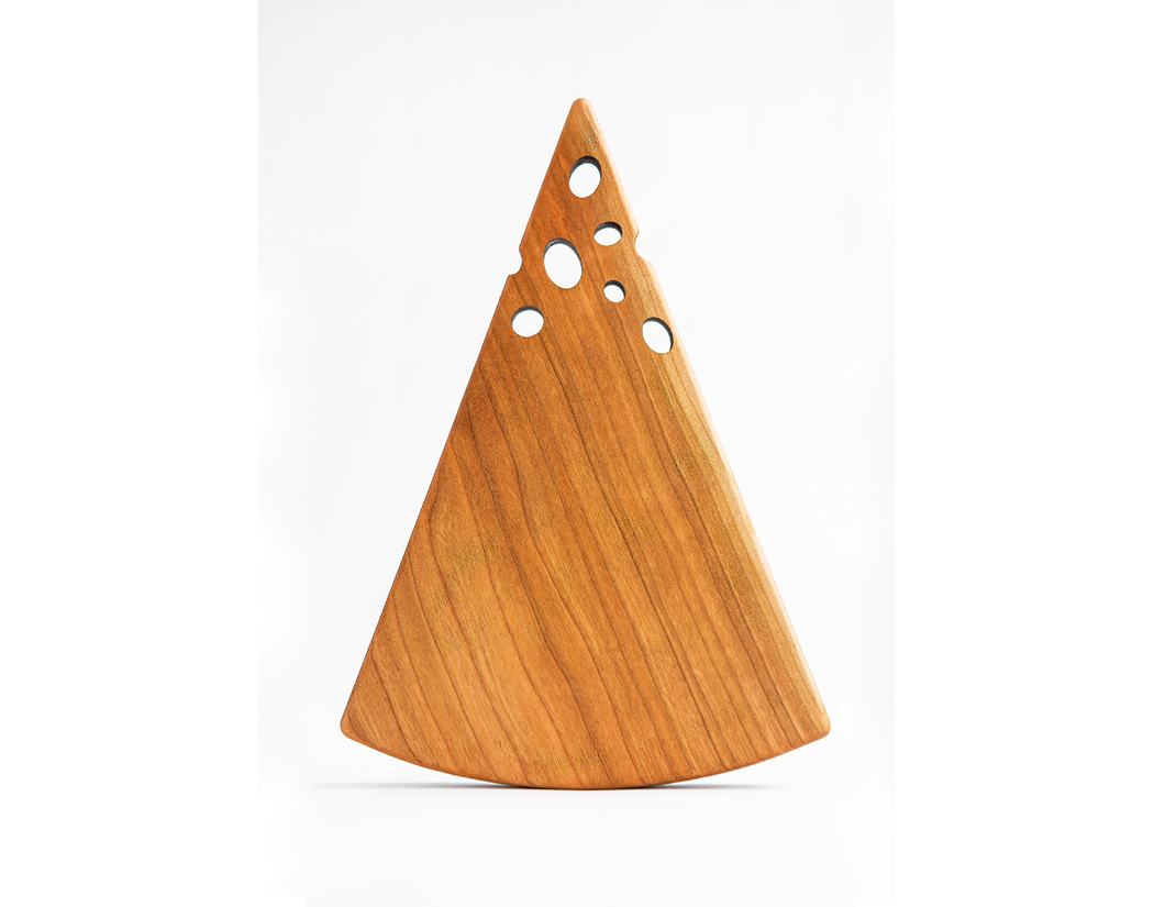 Cleverly hand-crafted butter board resembling a wedge of Swiss cheese. Made by Jonathan Simons who enjoys working with cherry wood exclusively for its grain, smoothness, durability and of course, beauty.