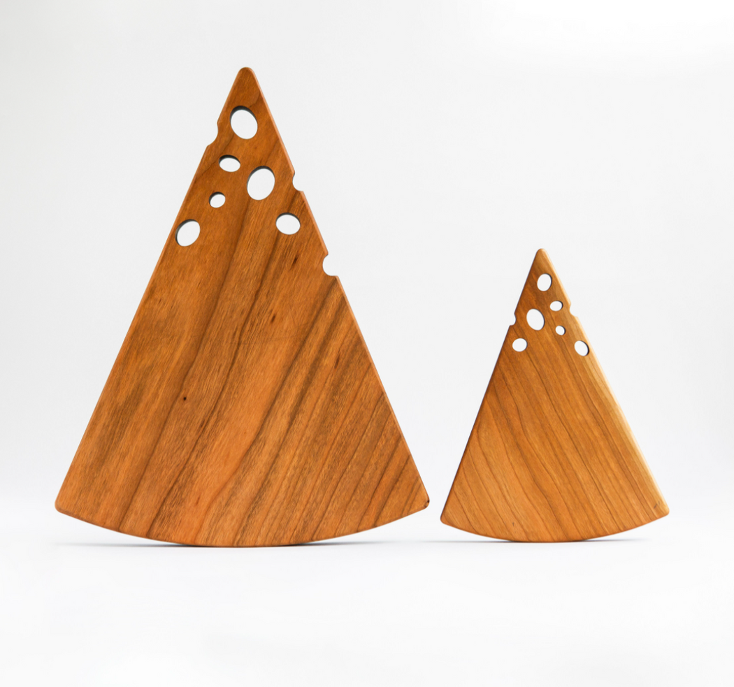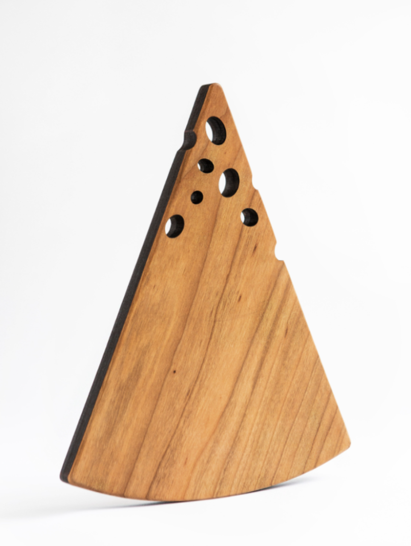 Cleverly hand-crafted cheese board resembling a wedge of Swiss cheese. Made by Jonathan Simons who enjoys working with cherry wood exclusively for its grain, smoothness, durability and of course, beauty.