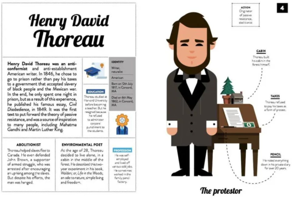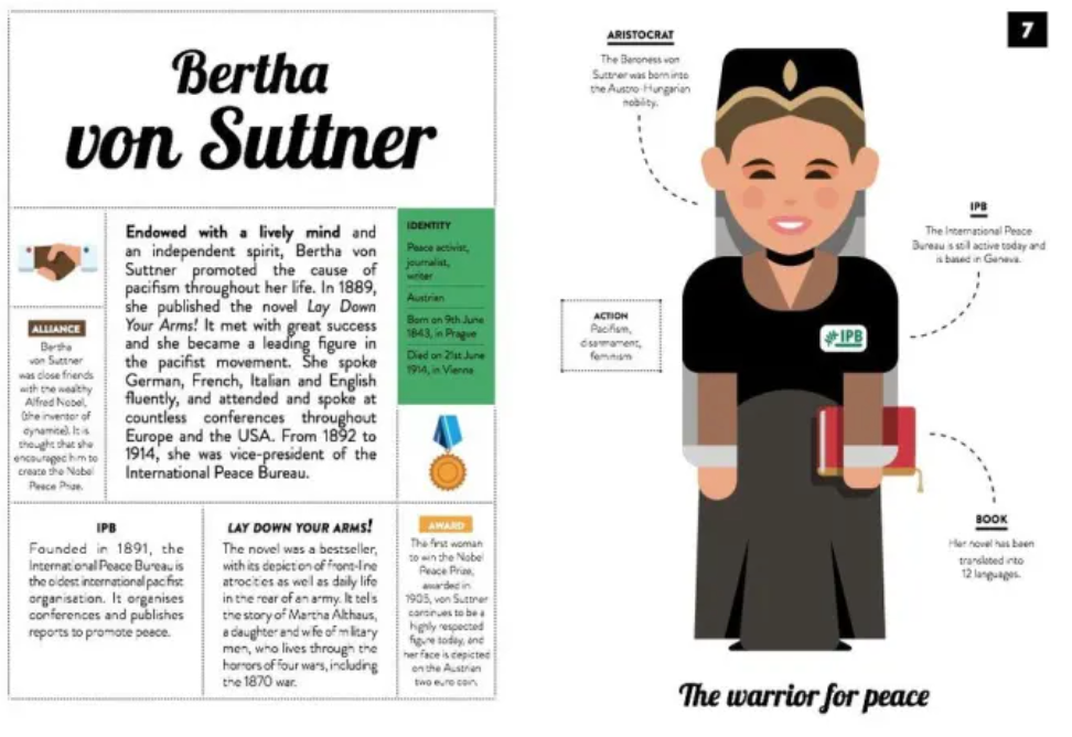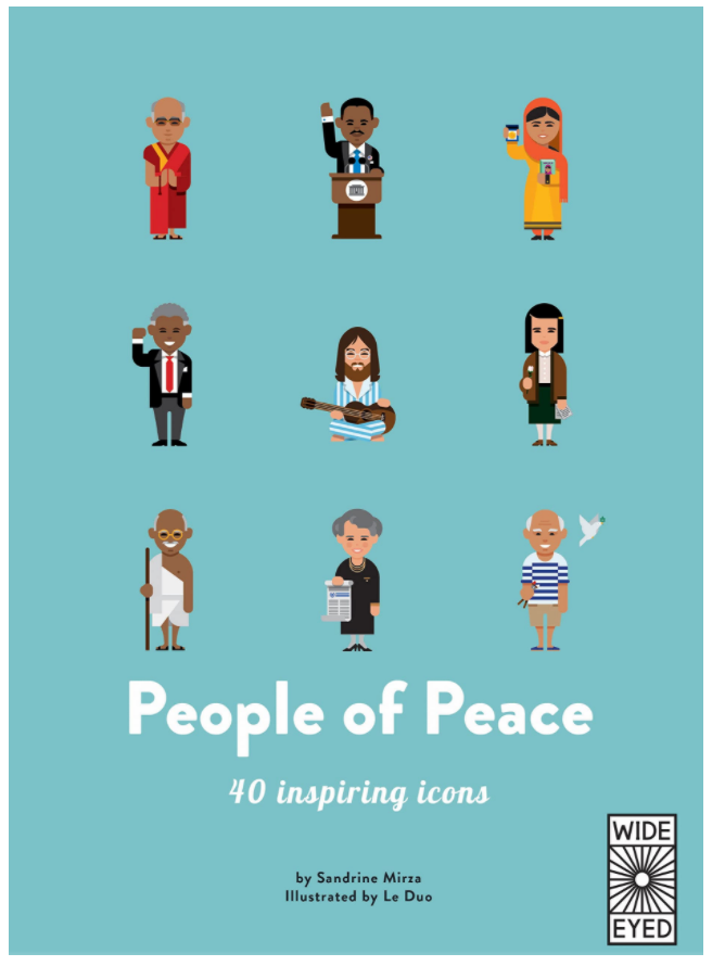 Each spread presents a single peacemaker, highlighting key facts about their identity, actions, and works, along with a fun, illustrated depiction of them that calls out elements of their life and style.