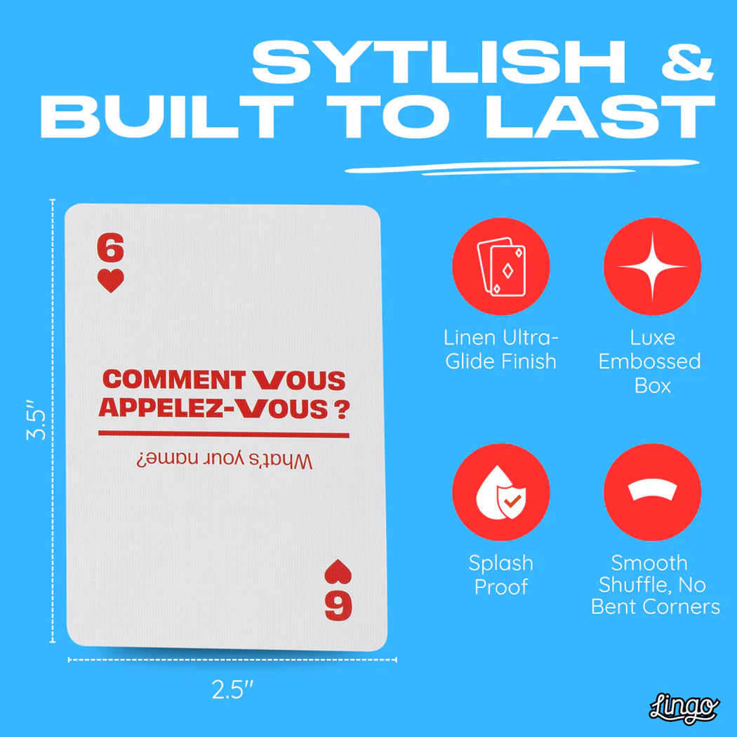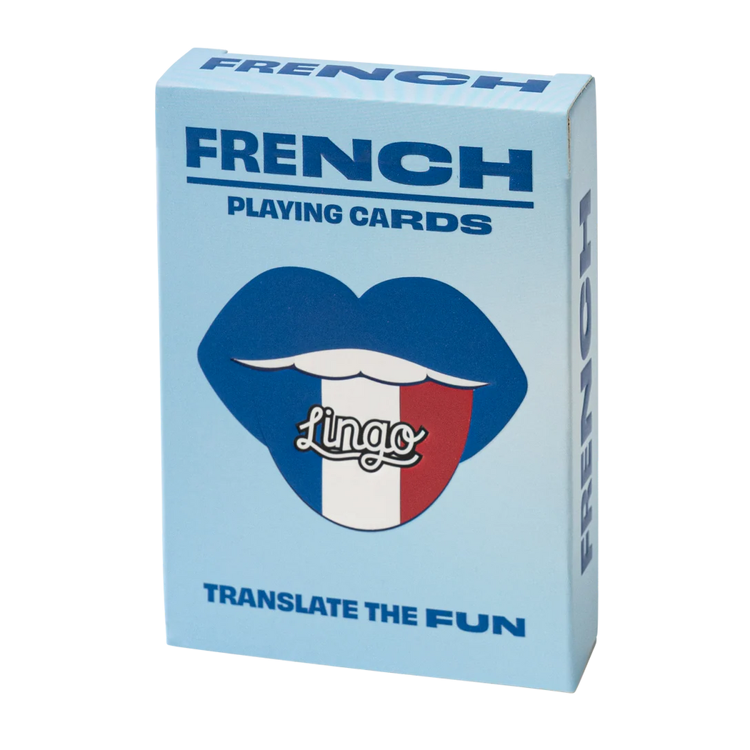 Say bonjour to effortless learning with French Lingo Playing Cards a chic blend of culture, travel, and classic gameplay. Each card features a beautifully designed French word or phrase with its English translation, helping you pick up the language naturally while you play. Perfect for Francophiles, travelers planning a Parisian escape, or anyone who loves adding a touch of sophistication to game night, this compact deck makes learning feel très élégant. Ideal as a gift or travel companion, it turns every shuffle into a step closer to la belle vie. Bon voyage!