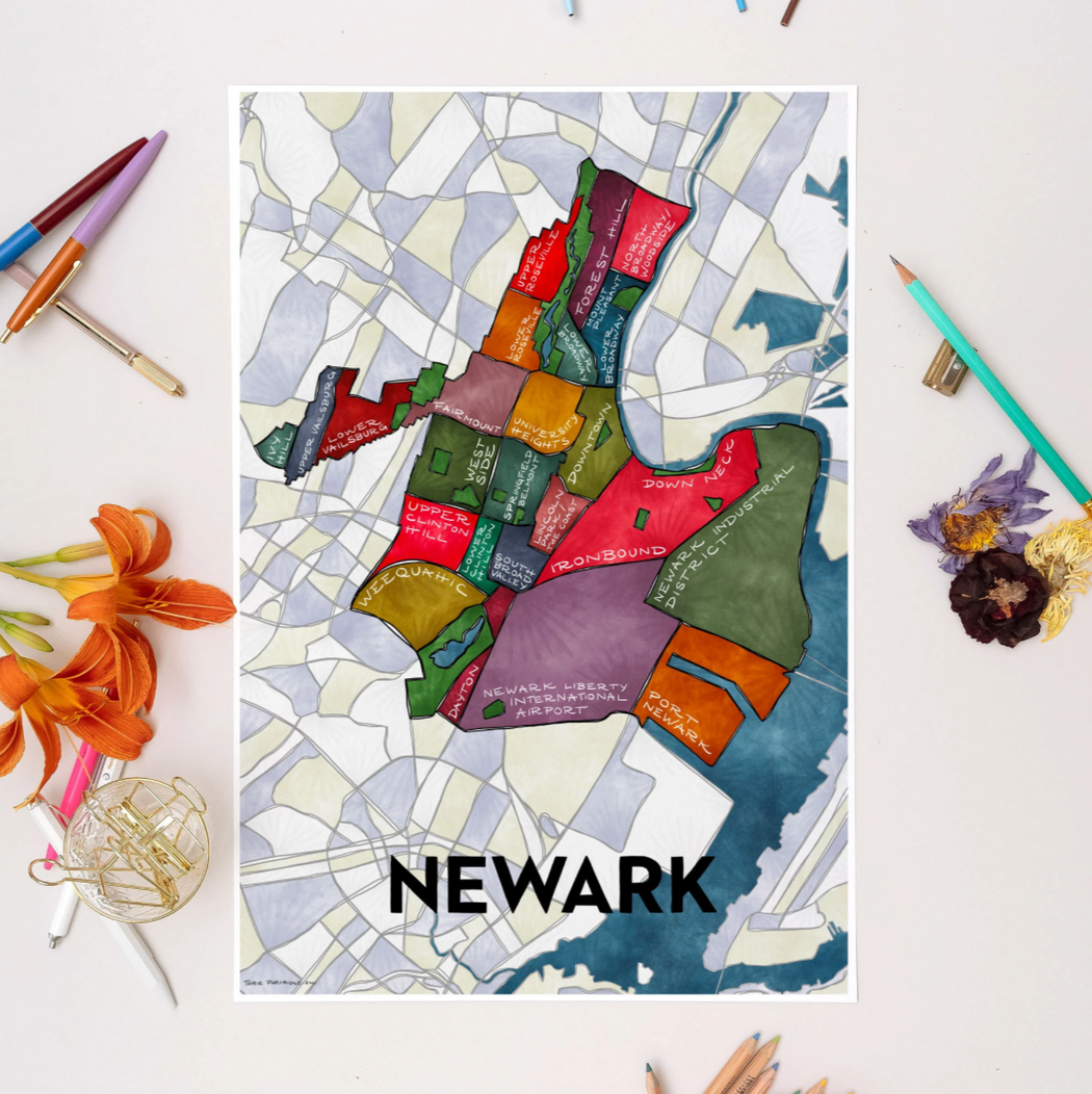 Hand-illustrated by Torie Partridge especially for The Newark Museum of Art. This Newark map includes all the neighborhoods in the city, as well as the city parks in a vibrant green.